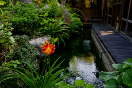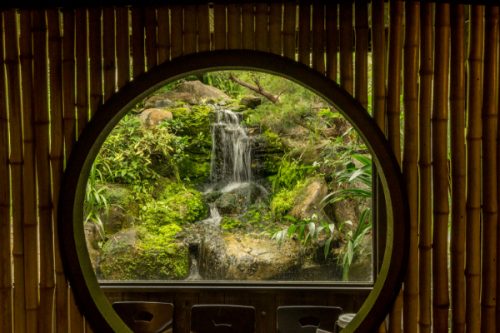 深緑の森に溶け込む様に、赤い屋根瓦が顔を覗かせます。藁葺きのひさしをくぐり中へ入ると、沖縄の伝統的な生活空間の中に、中庭の景色と大きな滝が現れます。ゆったりと自然を感じながら、大家自慢の料理をお楽しみください。